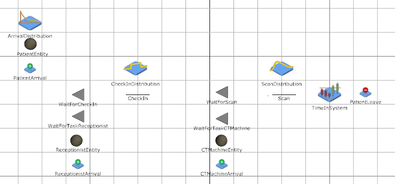Save your simulation again. If you run your simulation now you should see one receptionist arrive and wait, three CT machines arrive and wait, and patients arrive, and wait for check in. However nothing else will happen and all of the entities will simply be waiting, this is because we have not specified any logic to be triggered when the entities start waiting.