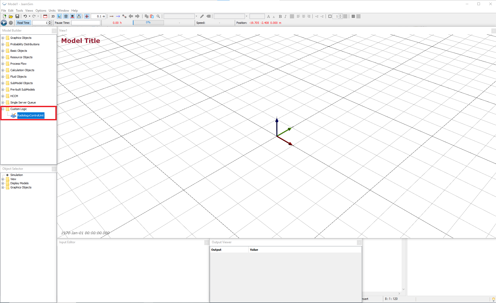 RadiologyControlUnit JavaClass { labs.RadiologyControlUnit } Palette { 'Custom Logic' } DefaultDisplayModel { AssembleIconModel } IconFile { '<res>/images/Assemble-24.png' } DefaultSize { 0.5 0.5 0.5 m }Once you have updated the sim_custom.inc file, restart Jaamsim. If everything is working correctly the RadiologyControlUnit object should now be available under the Custom Logic palette as shown in the screenshot below: