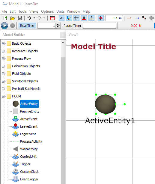 Run Jaamsim by opening your VSCode project and the clicking the run button and select GUIFrame. The HCCM palette on the left hand side allows us to create Jaamsim objects that correspond to the components of our HCCM conceptual models. Based on the problem description and conceptual model we need three types of entities: patients, receptionists, and CT Machines. To create each of these expand the HCCM palette in the Model Builder window, select ActiveEntity, and dragging it into the View Window, see Figure 7.1. Then in the Object Selector window select ActiveEntity1, press F2, and rename it PatientEntity. Alternatively, you can change the name by editing the value of the ‘Name’ Keyword, which is the top entry in the ‘Key Inputs’ tab.