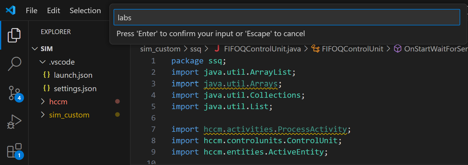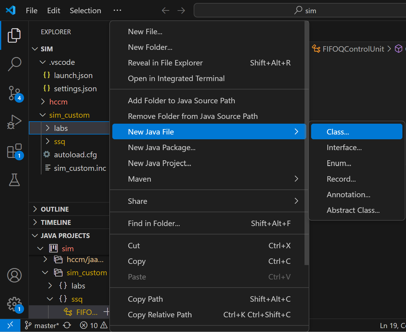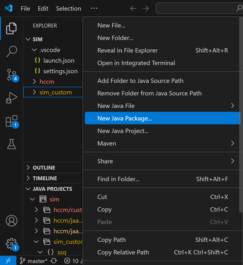 In your VSCode project you should have a folder called sim_custom under the Explorer tab on the left-hand side in VSCode. First right-click on this folder and select New Java Package. Enter labs for the name of the package and press Enter.